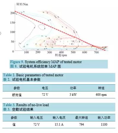 根據輪轂電機的性能要求,設計了輪轂電機的試驗項目,包括空載試驗、加載試驗、效率試驗等。下面以一臺自主研制的 3 kW 輪轂電機電機為例,進行試驗項目說明。電機的基本參數見表 2。3.1. 空載試驗 空載試驗主要測量電機的最高轉速、空載電流、損耗等[4]。試驗時,保持額定電壓不變,電機不帶 負載運行,逐步調節電機轉速至最大值,記錄電機的最高轉速、空載電流、輸入功率等參數。試驗結果 見表 3。3.2. 加載試驗 加載試驗時,給電機施加 1.5 倍額定輸出轉矩,然后逐步降低轉矩至0.25 N T ,適當選取若干個點, 記錄電機運行參數。根據所得數據,繪制電機的電流特性( inIT − 曲線)、機械特性(nT − 曲線)和功率特性 ( in PT − 、 outPT − 和 T η − 曲線),分別見圖 6~8。加載電流特性,是指輸入電流關于輸出轉矩的函數,輪轂電機的加載電流特性是一條斜率為正的直 線。機械特性,是指電機轉速關于輸出轉矩的函數。輪轂電機的機械特性是一條斜率為負的直線,與橫、 縱坐標的交點節距分別代表電機的堵轉轉矩和空載轉速。 功率特性,是指電機的輸入/輸出功率關于輸出轉矩的函數。為方便觀察,圖 8 中還給出了系統效率關于輸出轉矩的函數。3.3. 效率試驗 效率試驗的主要目的是測量電機和控制器在不同轉矩和轉速下的效率分布,并繪制系統效率 MAP 圖[5]。所謂系統效率MAP圖,是指系統效率關于電機轉速和輸出轉矩的二元函數 ( ) , f n T η = 曲面在nT − 平面的等高投影,是分析電機效率性能的重要依據。圖9給出了試驗電機的系統效率 MAP,圖中還畫出 了電機的機械特性及其擬合線。